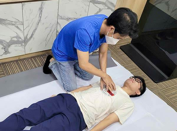 Nội dung tập huấn sơ cấp cứu đang được thực hành bởi nhân viên công ty.