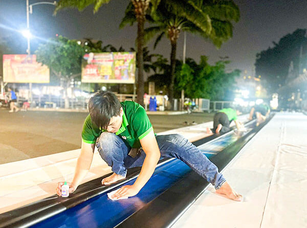 Để đáp ứng được yêu cầu nối bạt này, Quảng cáo Cường Khanh đã tìm một không gian đủ rộng và huy động đội ngũ nhân sự gia công in ấn lên đến hàng chục người. Sau nhiều giờ phối hợp nhịp nhàng, cả đội chính thức hoàn thành quá trình nối bạt và sẵn sàng giao cho đơn vị khách hàng để thi công. Sản phẩm hoàn thiện phải đạt được các yêu cầu về màu sắc in, đường nối tinh tế, độ bền bỉ của mực in và chắc chắn của mối nối.