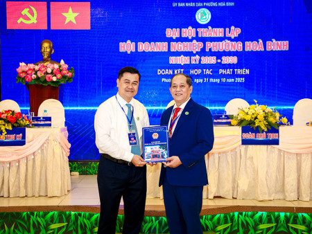 Ông Phạm Ngọc Cường (bên phải) – Giám đốc công ty chốt mua máy tại triển lãm.